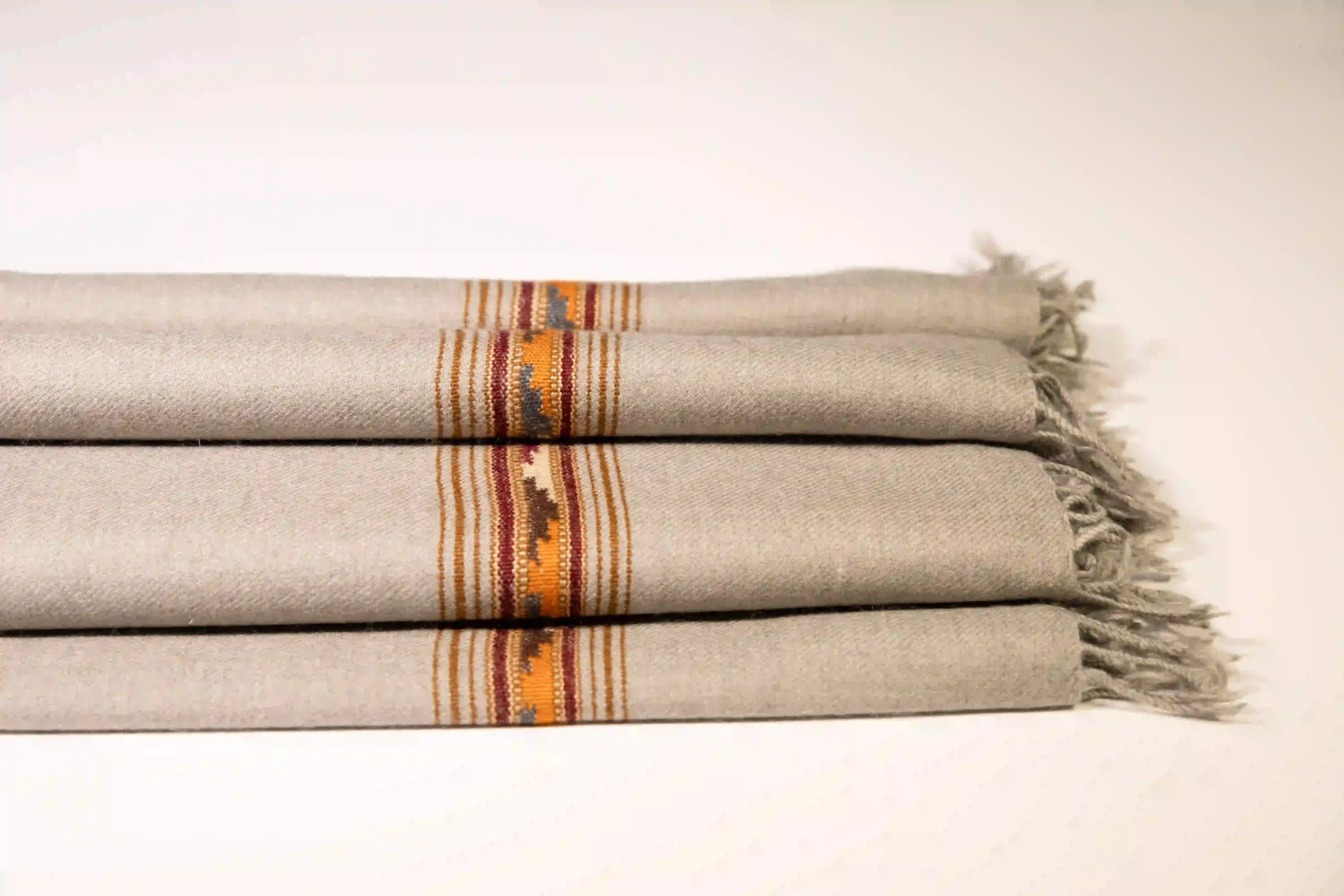 This gray shawl features the Pakistanay Gull pattern, handwoven by Islampur craftsmen using premium 48/2 wool. The patriotic design against a sophisticated gray background creates a versatile piece suitable for both formal occasions and cultural events. Traditional twill weaving ensures quality and comfort.