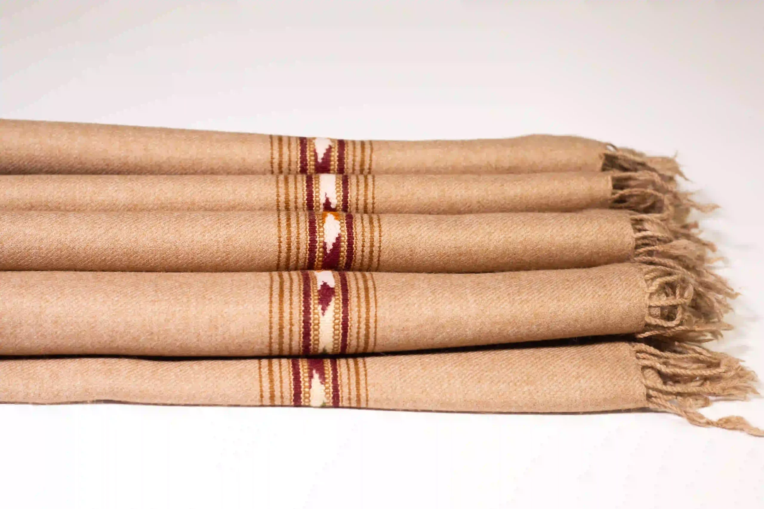 Rich brown shawl featuring traditional Katkay Gull pattern. Woven from 48/2 wool using authentic twill techniques. Embodies classic Swati design heritage and craftsmanship.