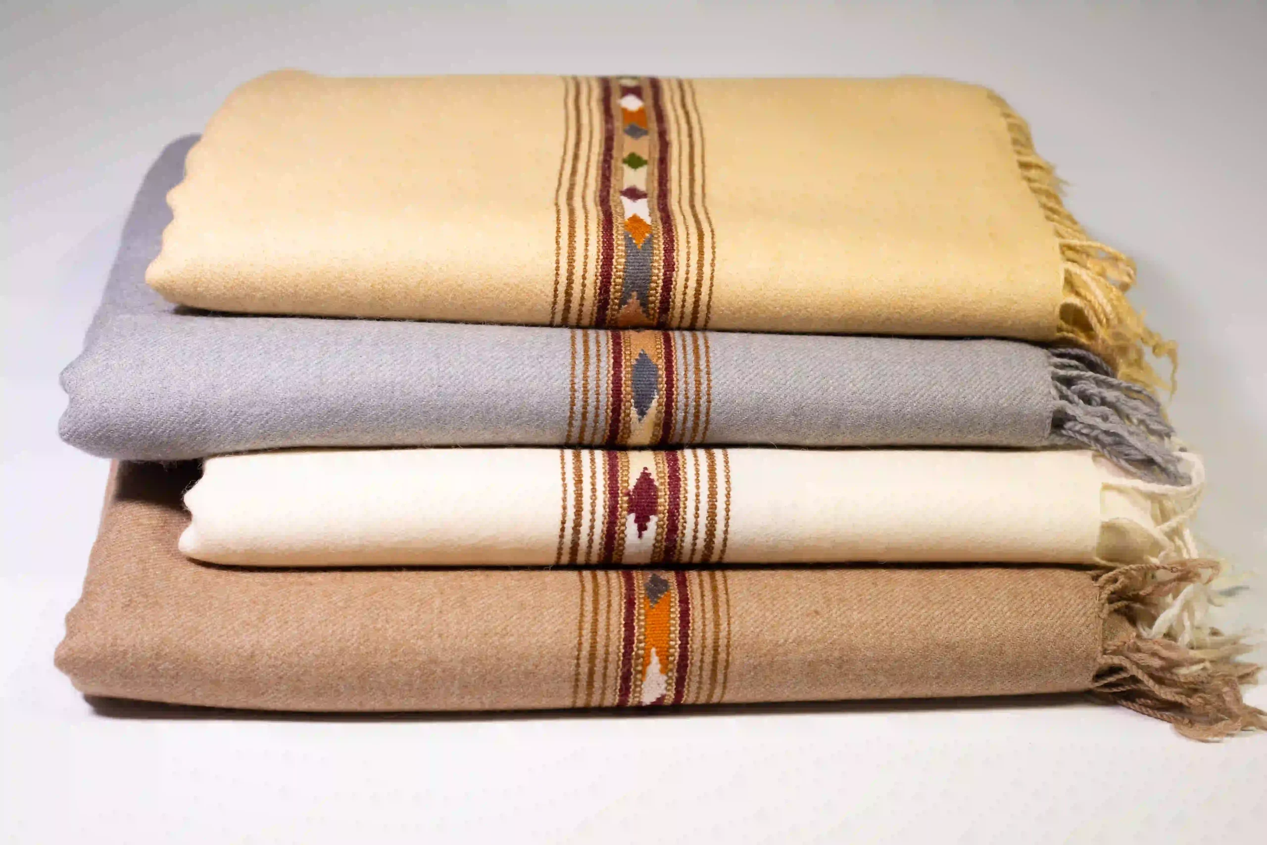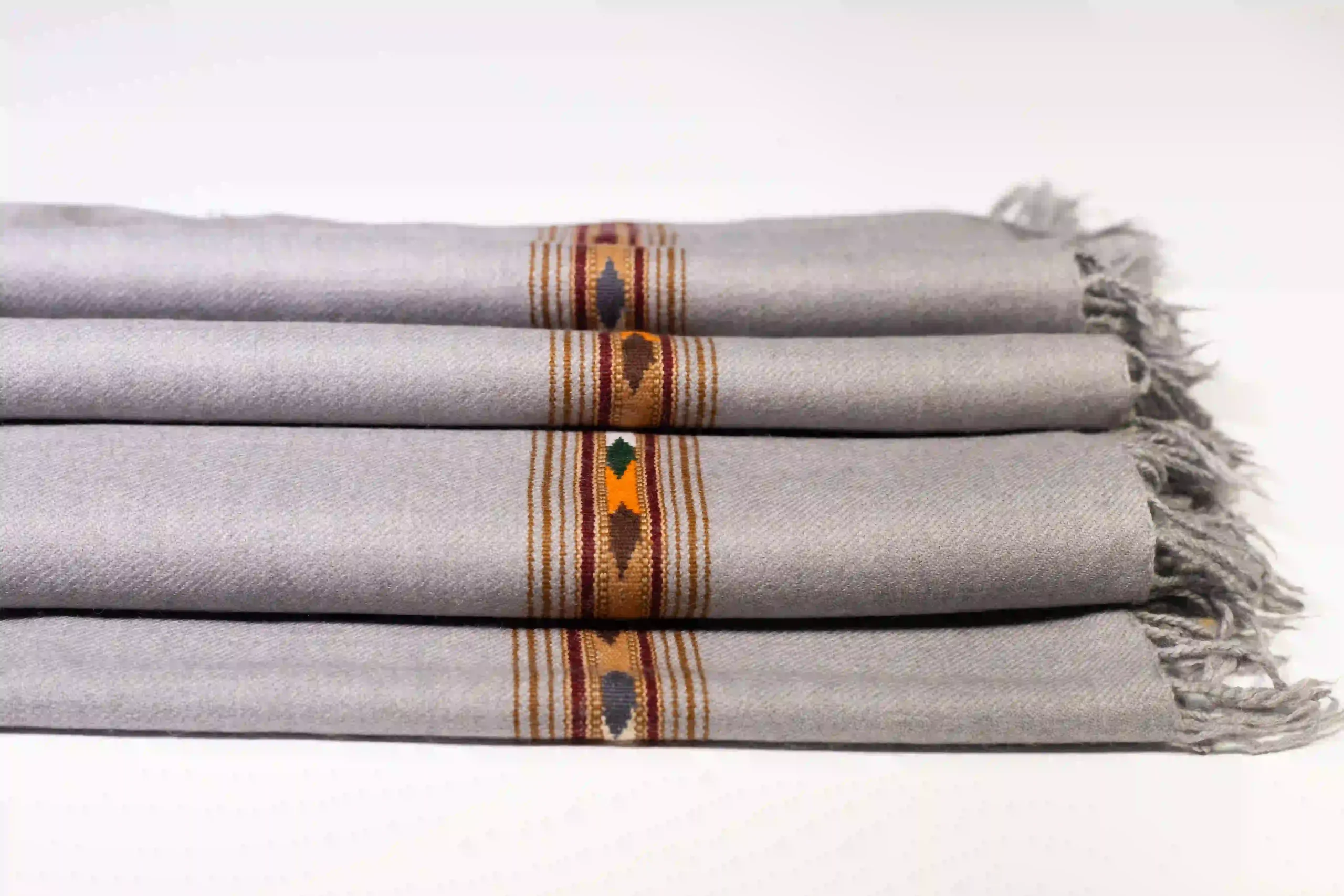 This gray Katkay Gull shawl features traditional patterning against a contemporary gray background, handwoven by Islampur artisans using 48/2 wool. The classic design elements are enhanced by modern color choices, creating a versatile piece that honors heritage while fitting contemporary styles.