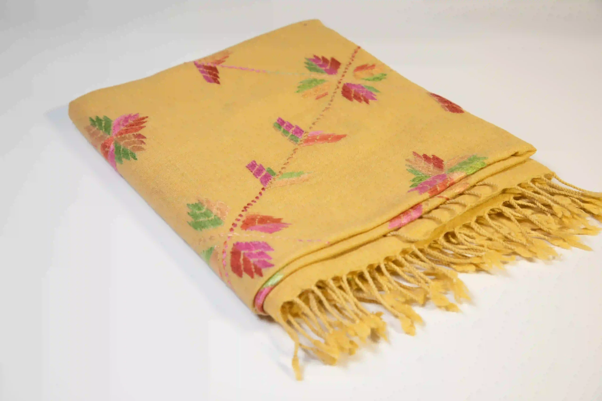 Meticulously handwoven on traditional looms using premium 48/2 wool, this shawl offers exceptional softness, a fine texture, and an elegant drape. The design is characterized by delicate hand-embroidery, where fine floral motifs are scattered across the fabric rather than concentrated in a heavy border. This subtle artistry, stitched by local women artisans, makes it a uniquely versatile and sophisticated piece for any occasion.