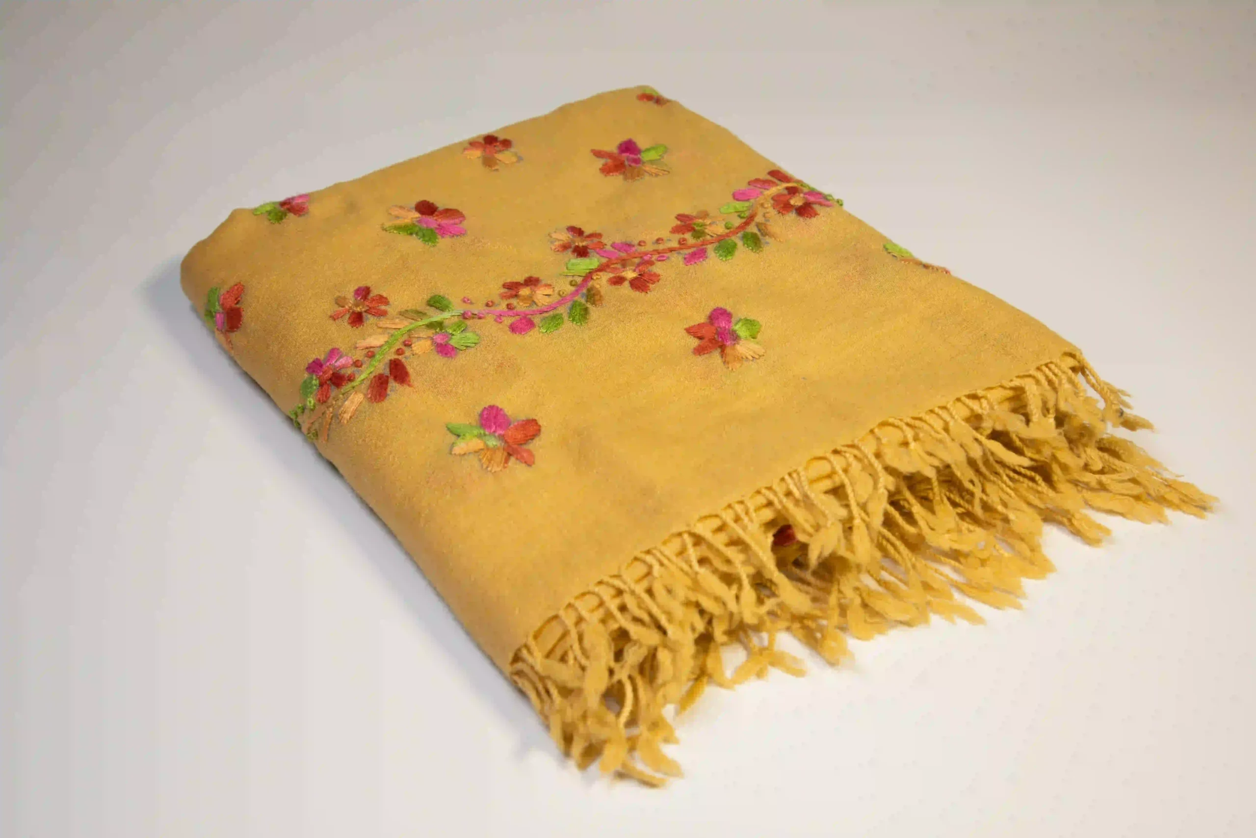 A commanding ladies’ shawl of premium 48/2 wool featuring a unique, grand design. The hand-embroidery is concentrated on the borders and enhanced by two elegant, vertical embroidered bands, creating a luxurious, structured, and highly traditional garment.